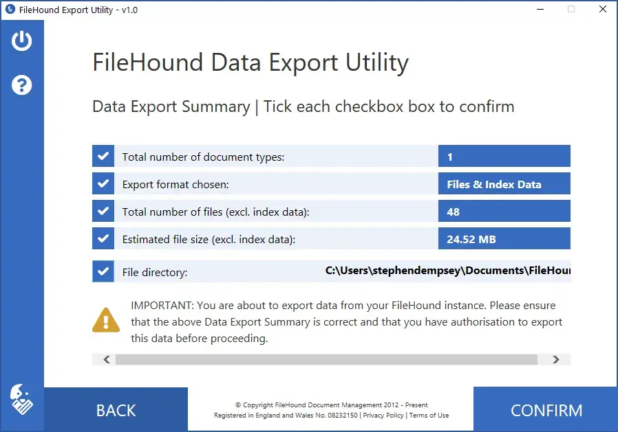 FileHound Export Utility를 사용하면 FileHound 관리자가 대체 백업 및 복구 목적으로 보안 문서 및 데이터 추출 작업을 실행할 수 있습니다. 이 응용 프로그램은 선택한 필터를 기반으로 FileHound에 저장된 모든 문서 및/또는 메타 데이터를 다운로드합니다. 메타데이터는 JSON 및 XML 형식으로 내보낼 수 있습니다.